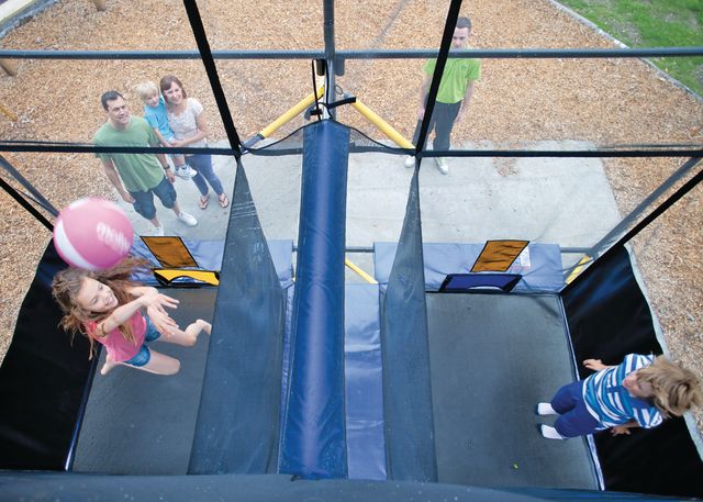 The set up typically consists of four trampolines put together in a 2 x 2 grid which are separated by a double depth safety netting. Each of four players works in their own trampoline pod and they are surrounded by safety netting to keep them away from the springs and the edge of the trampoline.